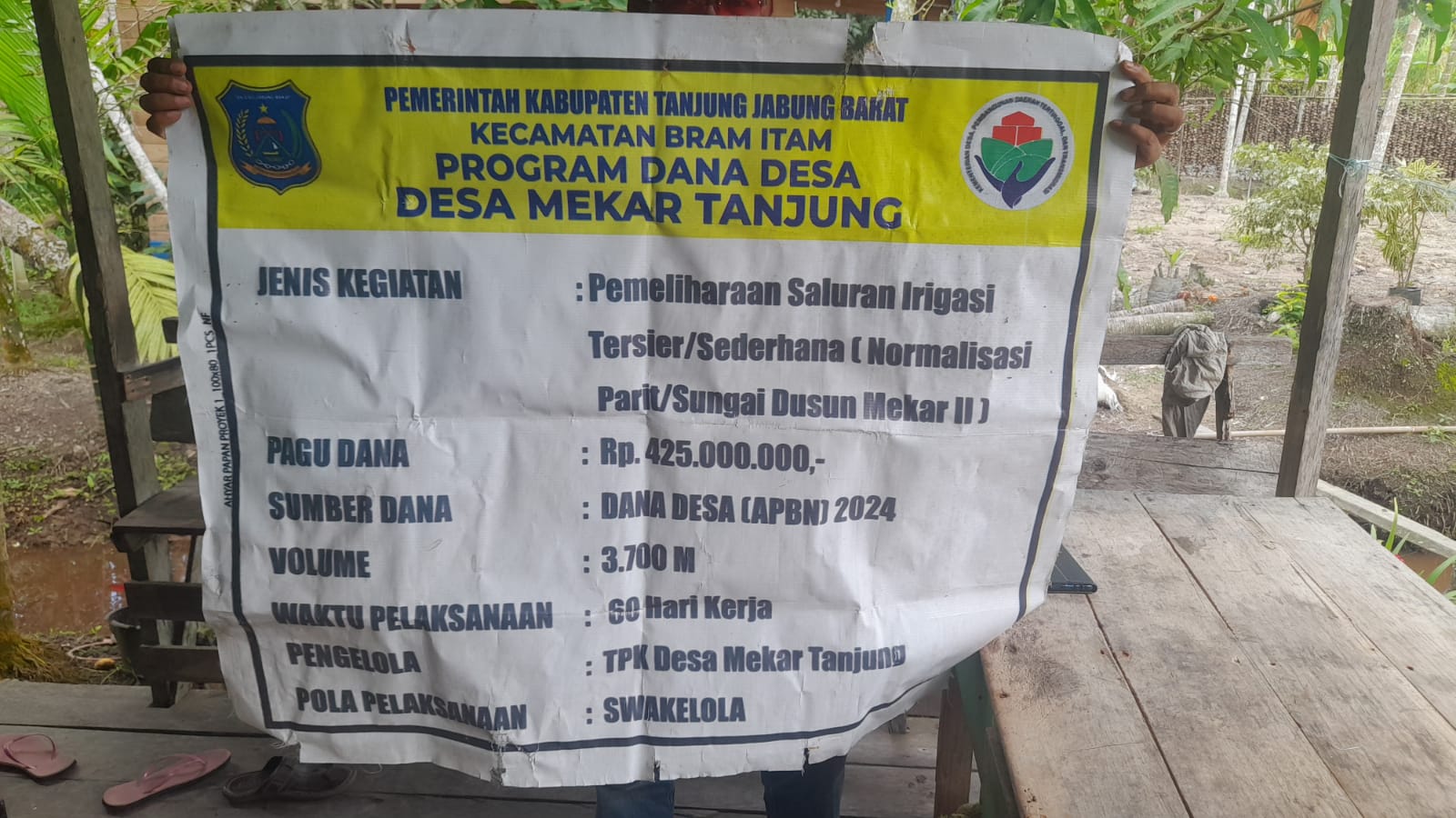 TANJAB BARAT- Warga Desa Mekar Tanjung kecamatan Bram Itam, kabupaten Tanjab Barat curiga ada permainan pihak Desa terkait proyek normalisasi parit tahun 2024 lalu. Selasa (11/2/2025).